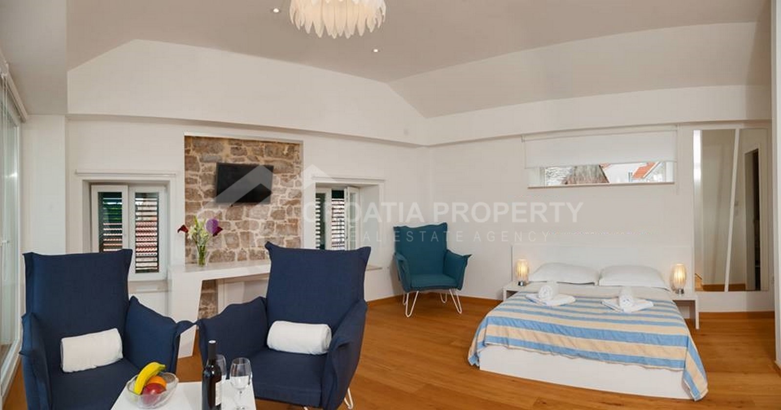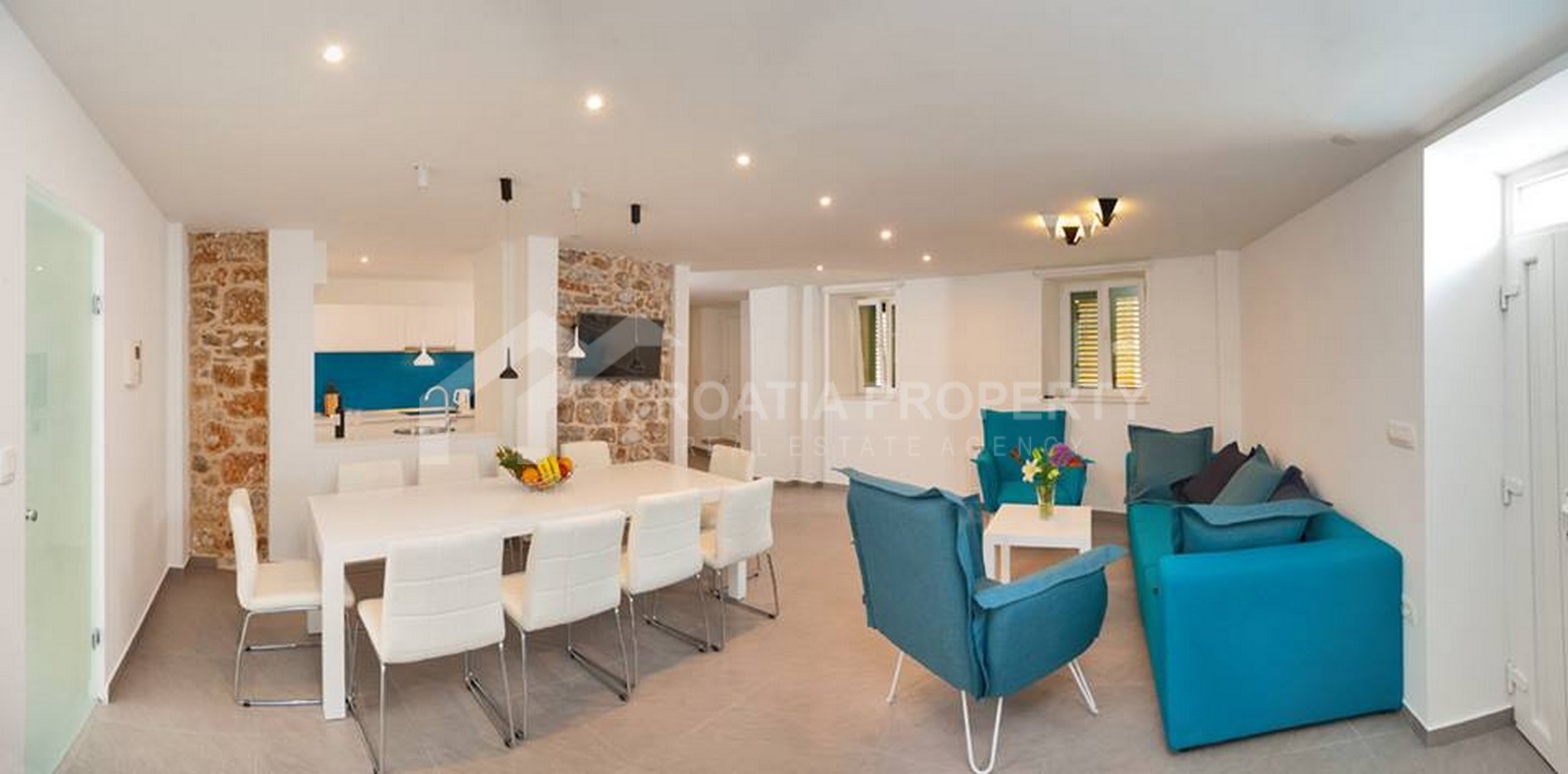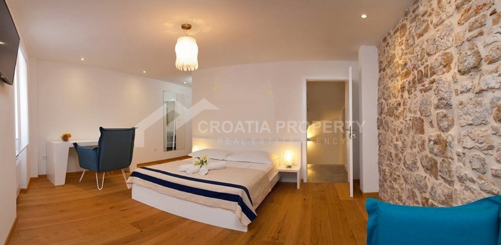 Ein ausgezeichnetes Steinhaus zum Verkauf Bol hat eine Wohnfläche von ca. 280 qm und es besteht aus einem Erdgeschoss, zwei Obergeschossen und einem Dachgeschoss, mit Pool, großen Terrassen und insgesamt 5 Schlafzimmern und Bädern. Das Erdgeschoss besteht aus einem offenen Wohnbereich, einem Badezimmer / Waschraum, einem Whirlpool und einer Sauna. Eine Innentreppe verbindet diese Ebene mit dem Rest des Hauses. Der erste und der zweite Stock haben jeweils zwei Schlafzimmer, die über ein eigenes Bad verfügen. Das Dachgeschoss umfasst das letzte Schlafzimmer und eine Terrasse von 30 m² mit Blick auf die kleine Stadt und das schöne Meer.