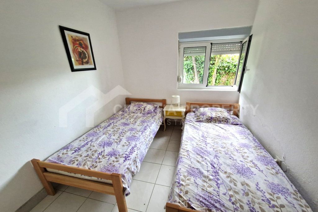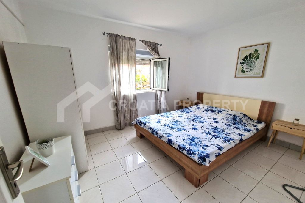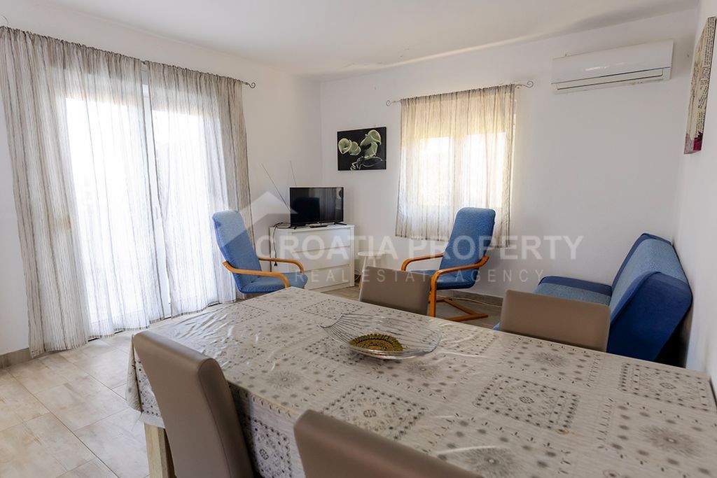 Im Erdgeschoss dieses freistehenden Reihenhauses Ciovo befindet sich ein 53 m² großes Apartment mit Terrasse und Meerblick, Wohnbereich, kleiner Küche, Badezimmer und zwei Schlafzimmern. Eine Außentreppe führt in das Obergeschoss mit einer geräumigen Terrasse und einem 23 m² großen Studio-Apartment. Im Garten befindet sich außerdem eine betonierte Auffahrt mit Platz für zwei Fahrzeuge. Die Eigentumsverhältnisse sind geklärt.