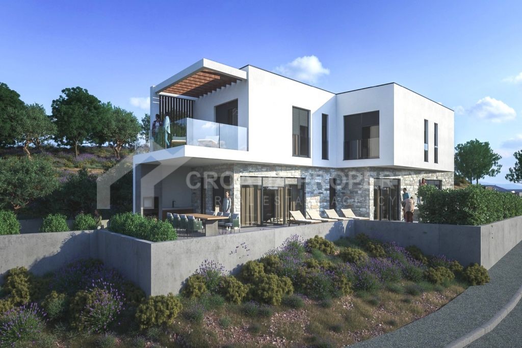 Moderne Villa mit Aussicht Primosten gebaut und mit hochwertigen Materialien und Geräten ausgestattet: elektrische Jalousien, Parkett/Keramik nach Wahl des Kunden in der Preisklasse gemäß Preisliste, das Wohnzimmer und die Badezimmer werden über Fußbodenheizung verfügen eine Wärmepumpe, in der Garage wird es Ladestationen für Elektroautos und einen betonbeheizten Swimmingpool geben. Im Hof werden Parkplätze für drei Autos zur Verfügung gestellt. Die Möglichkeit, Materialien und Ausstattung nach Wahl des Kunden und gegen Aufpreis zu ändern, abhängig von der Möglichkeit der Anpassung und dem Umfang der am Gebäude durchgeführten Arbeiten. Der geplante Fertigstellungstermin der Anlage ist Juli 2025.