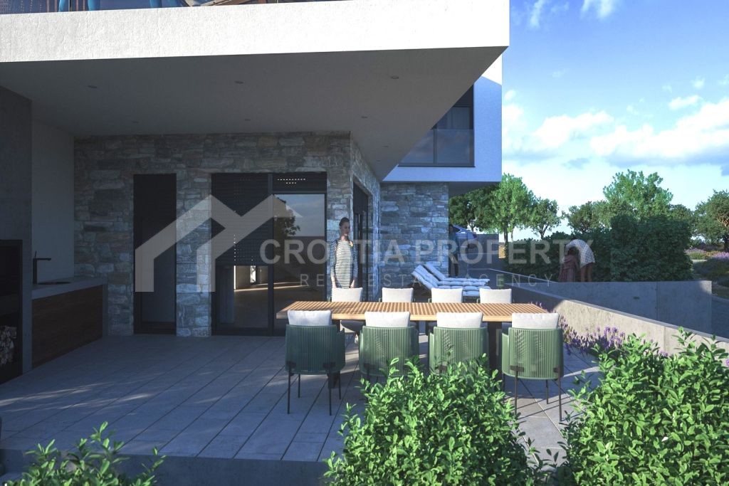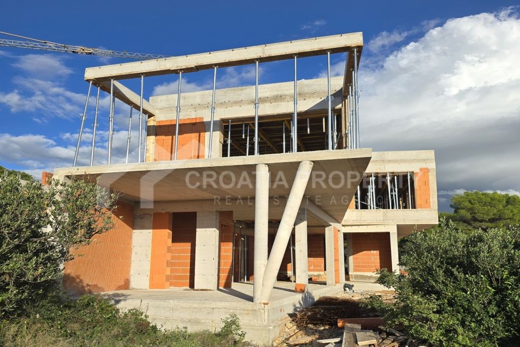 Moderne Villa mit Aussicht Primosten im Bau, in einem ruhigen Teil von Primosten, 850 m vom Strand und dem Stadtzentrum entfernt ist zum Verkauf. Die Villa wurde auf einem Grundstück von ca. 570 m2 gebaut, mit einer Gesamtnettonutzfläche von ca. 242 m2 und wird sich über zwei Etagen verteilen. Im Erdgeschoss befinden sich eine Garage, ein Maschinenraum, ein Wellnessbereich mit Toilette, ein zusätzliches Gäste-WC, eine Küche mit Esszimmer und ein Wohnzimmer mit Zugang zu einer schönen überdachten Terrasse mit Sommerküche, Sitzecke und Liegewiese am Pool. Eine Innentreppe führt in den ersten Stock, der aus vier Schlafzimmern mit jeweils eigenem Bad und Ankleidezimmer, Abstellraum und Flur besteht. Das Hauptschlafzimmer führt zu einer geräumigen Terrasse mit einer Pergola von 22 m2.