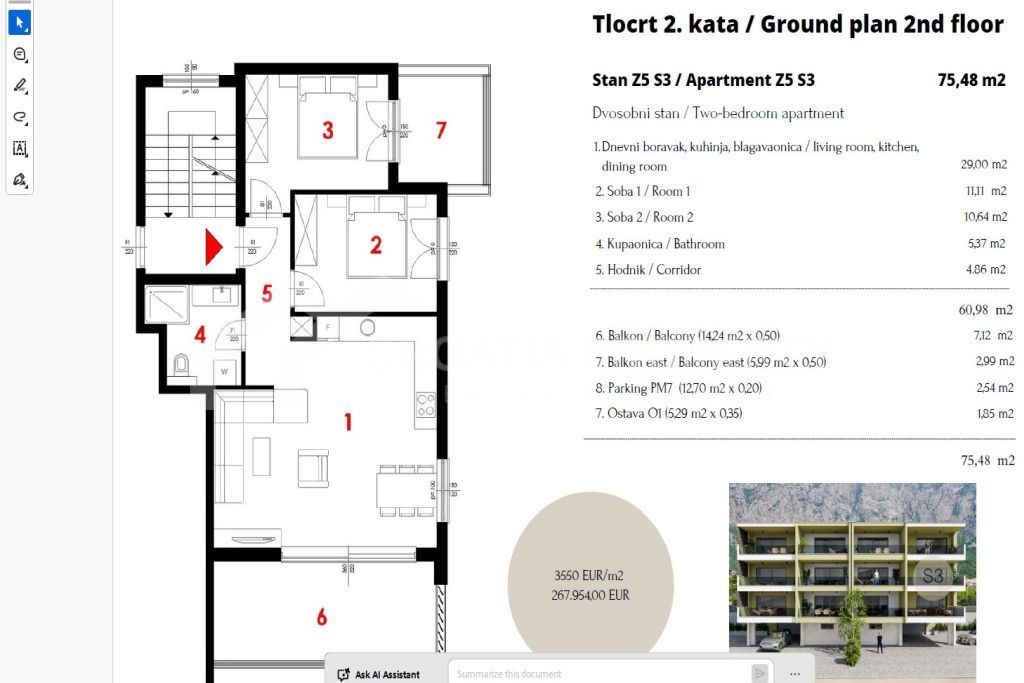 Wir vermitteln den Verkauf einer herausragenden Zwei-Zimmer-Wohnung mit Stellplatz Makarska. Das Gebäude befindet sich in der Endphase der Fertigstellung; die Fertigstellung ist für spätestens ein Jahr geplant. Die Wohnung liegt im zweiten Obergeschoss und bietet eine Wohnfläche von 60,98 m². Sie verfügt über zwei Schlafzimmer, einen Flur, ein Badezimmer und ein großzügiges Wohnzimmer mit integrierter Küche. Zusätzlich gibt es zwei schöne, jeweils 10 m² große Balkone mit Meerblick, die nach Osten und Süden ausgerichtet sind. Im Kaufpreis enthalten sind ein fester Außenstellplatz (2,54 m²) und ein Abstellraum (1,85 m²).