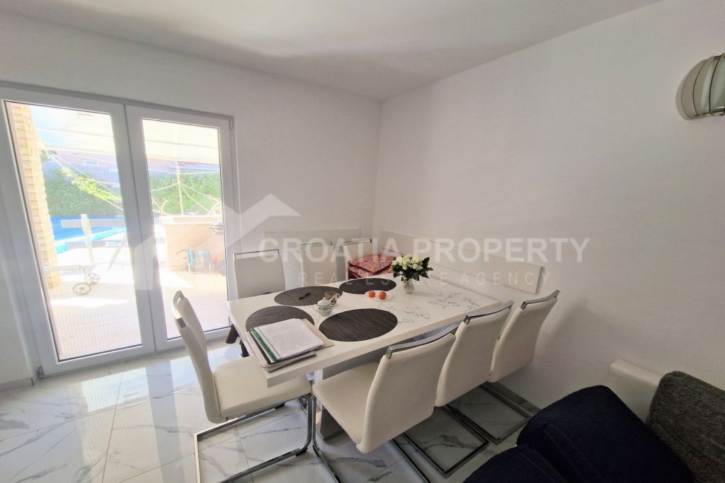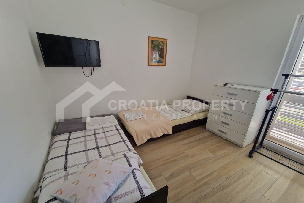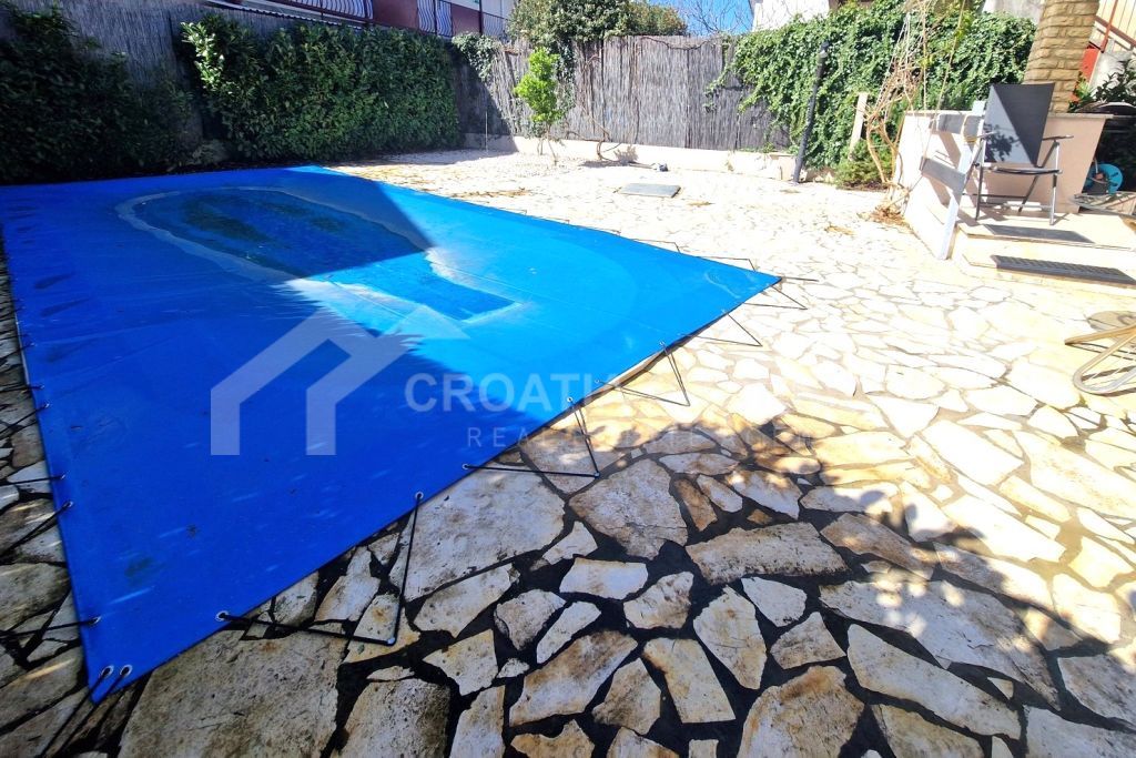 Prizemlje kuće sadrži hodnik, spavaću sobu s vlastitom kupaonicom, kuhinju i prostrani dnevni boravak povezan s blagovaonicom. Iz dnevnog boravka i kuhinje pristupa se natkrivenoj terasi i vrtu s grijanim bazenom. Unutarnje stubište omogućuje pristup gornjoj etaži, koja uključuje tri dodatne spavaće sobe, svaka opremljena vlastitim WC-om, kupaonicom i terasom. Ovo stubište također vodi na krovnu terasu s kaminom i jacuzzijem. Prostran vrt okružuje bazen, uključuje popločano sunčalište, spremište i parking za dva vozila. Ova kuća s bazenom u blizini plaže Pirovac savršena je za obitelji koje traže kuću za odmor, a istovremeno ostaju blizu plaže i raznih sadržaja. Sva vlasnička dokumentacija je kompletna.