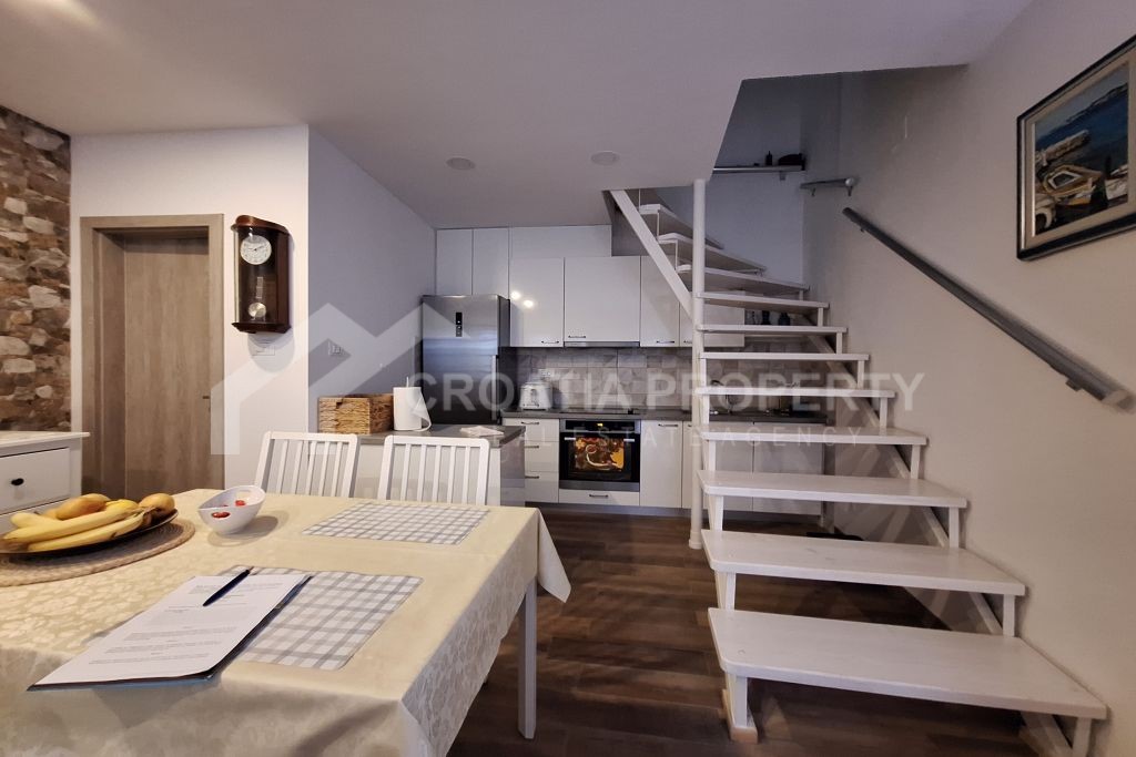 Prodaje se renovirana i vrlo šarmantna mala kuća u blizini mora Baška Voda, na izuzetno atraktivnoj lokaciji u samom centru mjesta. Riječ je o dvojnoj kući ukupne površine 66 četvornih metara koja se prostire kroz prizemlje i prvi kat. Prizemlje se sastoji od dnevnog boravka s kuhinjom, WC-a te vrlo šarmantnog dvorišta koje je trenutno uređeno kao blagovaonica. Na katu se nalazi hodnik, spavaća soba s kupaonicom i lijep balkon.