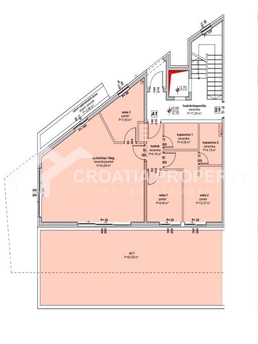 Prekrasan, vrlo prostran, iznimno dobro namješten apartman Baška Voda, na prodaju na atraktivnoj lokaciji u centru grada. Ukupna unutarnja površina apartmana iznosi 82 četvorna metra. Sastoji se od ulaza, hodnika, 3 spavaće sobe, 2 kupaonice i zaista impresivnog dnevnog boravka s kuhinjom i blagovaonicom. Dnevni boravak otvara se na veliku terasu – tlocrtne površine 66 četvornih metara, s koje se pruža pogled na more i Bašku Vodu.