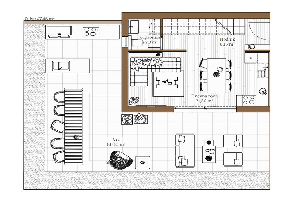 Gornji kat ovog novog dvoetažnog stana Kaštela sastoji se od 2 spavaće sobe i još jedne kupaonice. Zgrada također uključuje spremišta i vanjska parkirna mjesta, koja su dostupna uz dodatnu naknadu. Svaki stan je opremljen s pažnjom posvećenom detaljima i visokim građevinskim standardima. Što se tiče opreme, odabrani su renomirani proizvođači koji jamče trajnost, funkcionalnost i estetiku: Daikin klima uređaji, Hansgrohe i Geberit sanitarije, podno grijanje u kupaonicama, a u dogovoru s investitorom može se implementirati u cijelom stanu u ovoj fazi, talijanska vrhunska keramika, hrastov parket I. kategorije, aluminijska vanjska stolarija itd. Očekivano useljenje je proljeće 2027. godine.