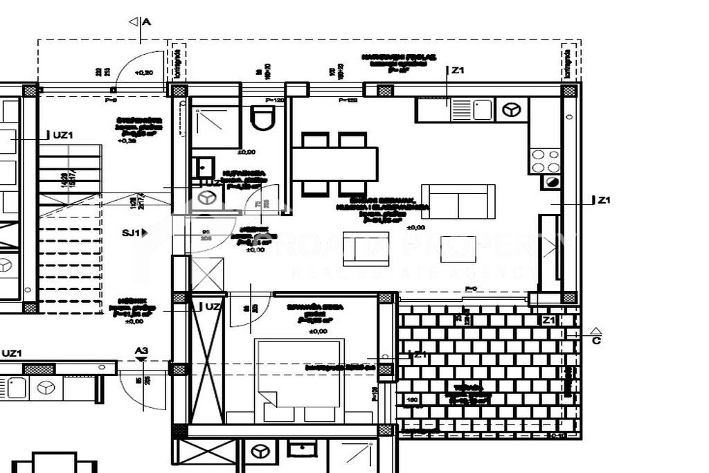 Posredujemo u prodaji novog prizemnog stana Vodice, smještenog na odličnoj lokaciji u blizini plaže i centra. Plaža je udaljena samo 400 metara, dok je centar udaljen 700 metara. Zgradu gradi tvrtka s dugogodišnjim iskustvom u izgradnji kvalitetnih stambenih objekata na području Šibenika. Kupac ne plaća porez na nekretnine. Stan oznake SJ1 nalazi se u prizemlju zgrade. Ima ukupnu korisnu površinu od 54,47 m2, od čega je 39,37 m2 unutarnji prostor, a 15,10 m2 terasa s malim vrtom. Uključujući pripadajući posjed i vanjsko parkirno mjesto, stan ima neto površinu od 45,80 m2. Sastoji se od ulaznog hodnika, kupaonice, spavaće sobe, kuhinje s blagovaonicom i dnevnog boravka s izlazom na terasu.