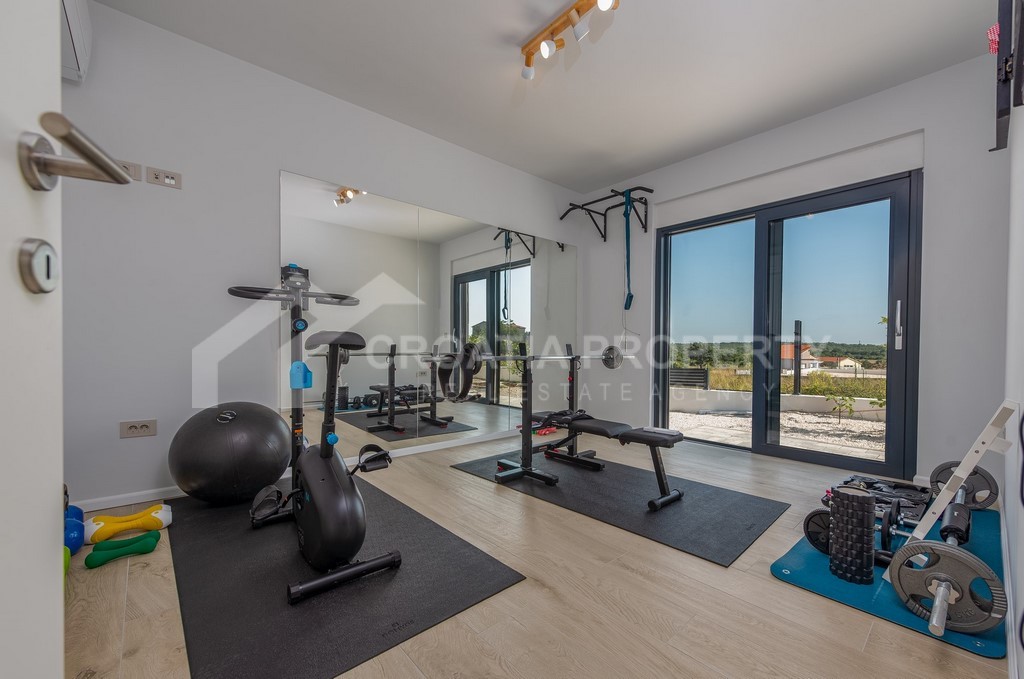 Ova obiteljska kuća u novogradnji Zadar, također ima i teretanu u prizemlju. Kuća je puna prekrasnih terasa na svakoj etaži i velikih kliznih stijena, što omogućava prirodno osvjetljenje i prekrasan pogled na okolicu cijeli dan. Na velikoj krovnoj terasi nalazi se jacuzzi i ležaljka. Kuća je vrhunski opremljena, klima uređaji u svim sobama, podno grijanje u cijeloj kući, automatski aparat za kemikalije u bazenu koji se grije, navodnjavanje u vrtu, kuća ima toplu vodu preko toplinske pumpe, stolarija je opremljena je komarnicima i električnim griljama, a postoji i video nadzor. U dvorištu je moguće parkirati 3 automobila. Vlasništvo uredno.