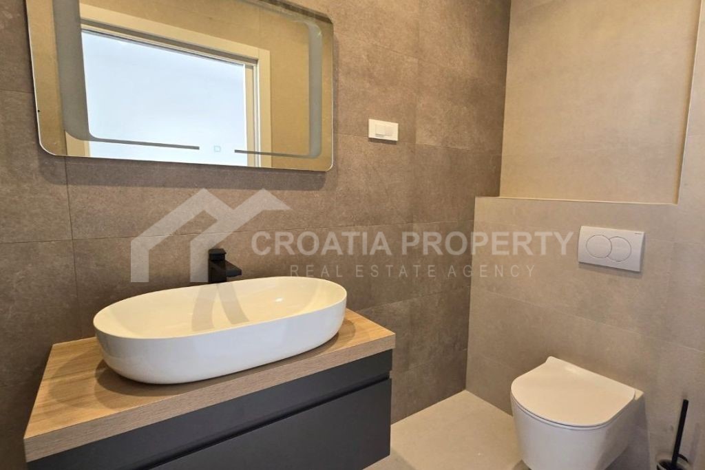Penthouse u novogradnji Vodice, udaljen 300 metara od prekrasne šljunčane plaže je na prodaju. Apartman se nalazi na drugom katu manje zgrade. Ukupne je stambene površine 89m2, od čega je 70m2 unutarnjeg prostora i 19m2 natkrivene terase s prekrasnim pogledom na more. Sastoji se od hodnika, 3 spavaće sobe, 2 kupaonice, te prostrane kuhinje s blagovaonicom i dnevnim boravkom otvorenog koncepta.