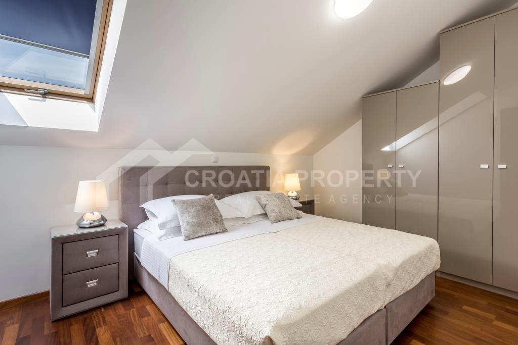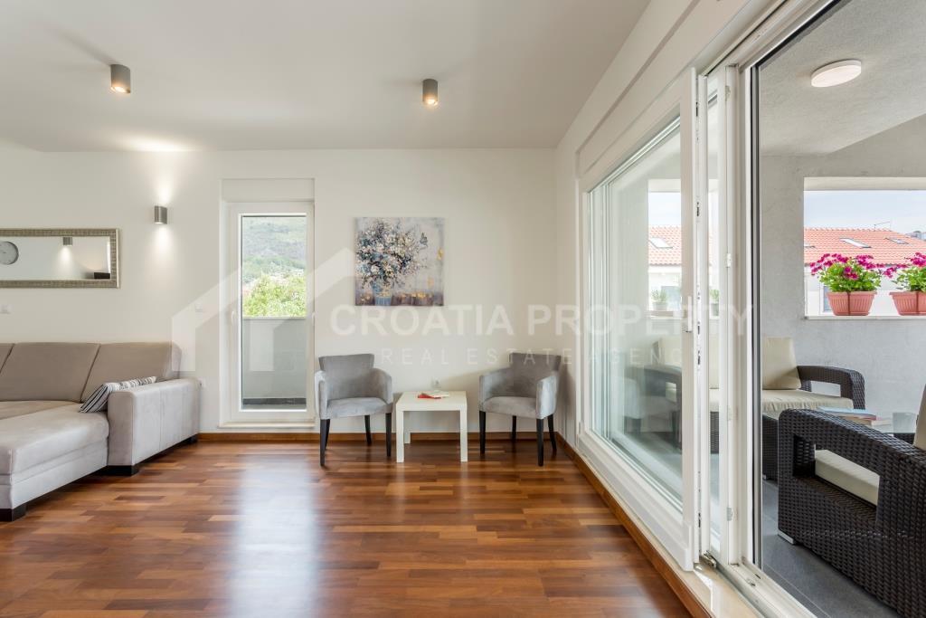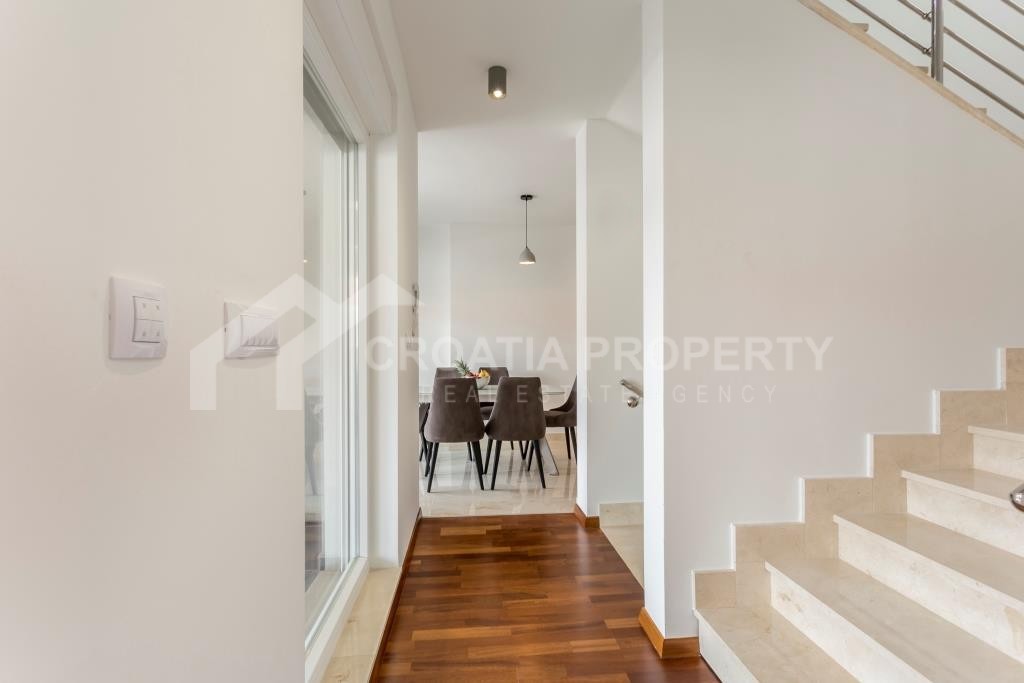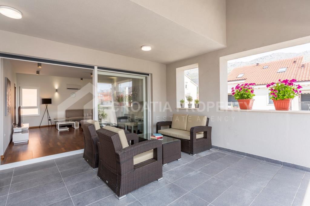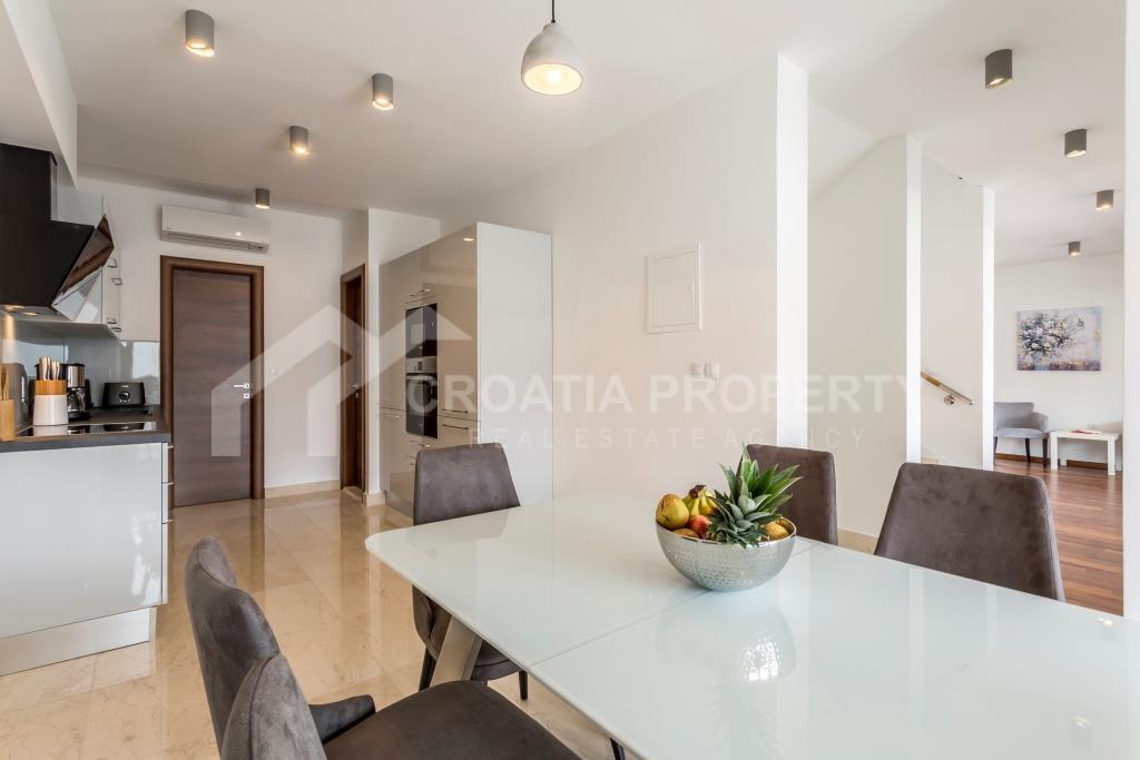 Na donjoj etaži apartman se sastoji od ulaznog prostora, hodnika, kupaonice, spremišta, izuzetno velikog dnevnog boravka i kuhinje koja je povezana s blagovaonicom. Cijeli donji kat otvara se na prostranu terasu s slikovitim pogledom na more, uz manju terasu. Gornji kat sadrži hodnik, glavnu spavaću sobu s vlastitom kupaonicom, dvije dodatne spavaće sobe i drugu kupaonicu. Trosobni apartman uz more Podstrana dolazi potpuno namješten i opremljen, a sve je uključeno u cijenu. Svaka soba ima klima uređaj, a vanjski prozori su od PVC-a. Vlasnička dokumentacija je uredna.