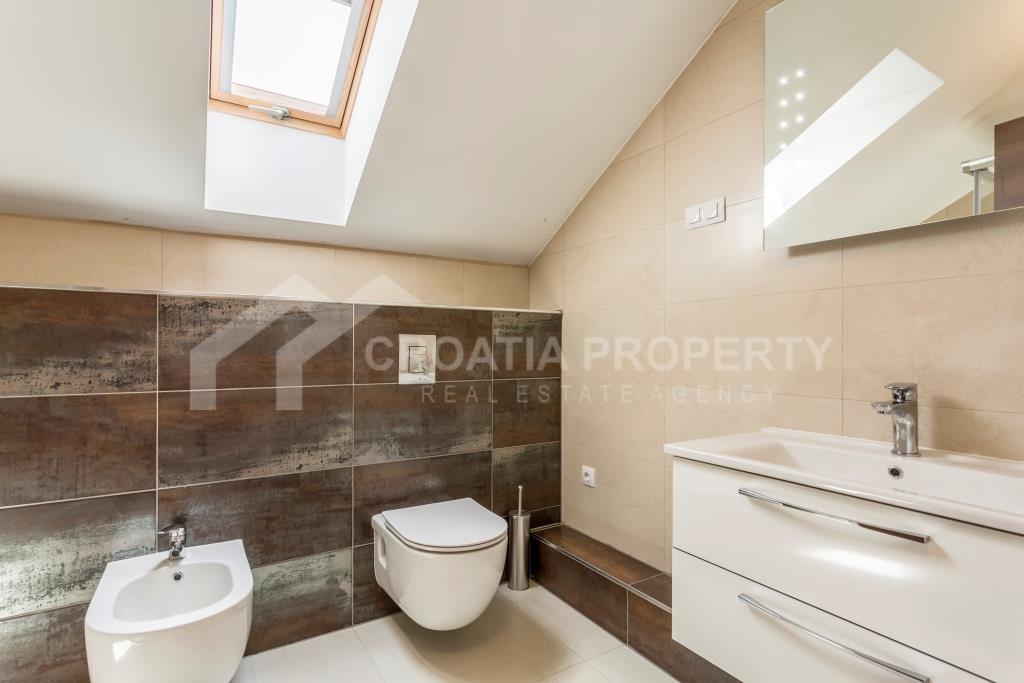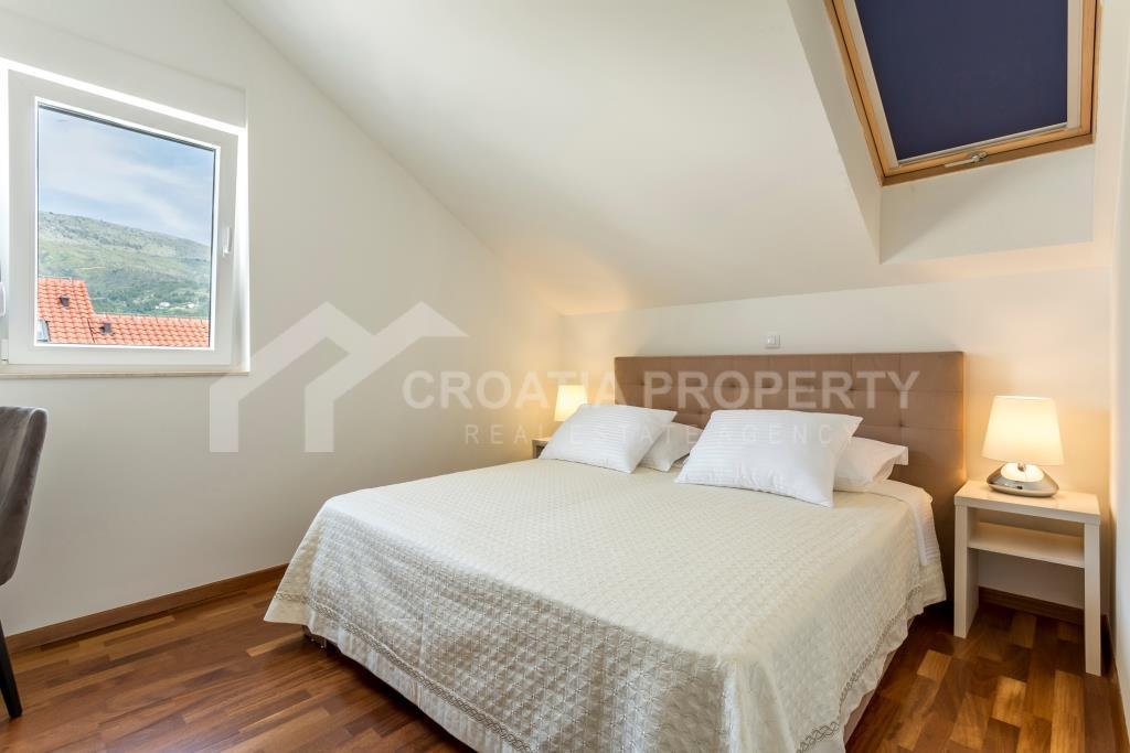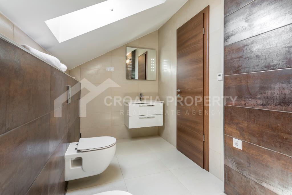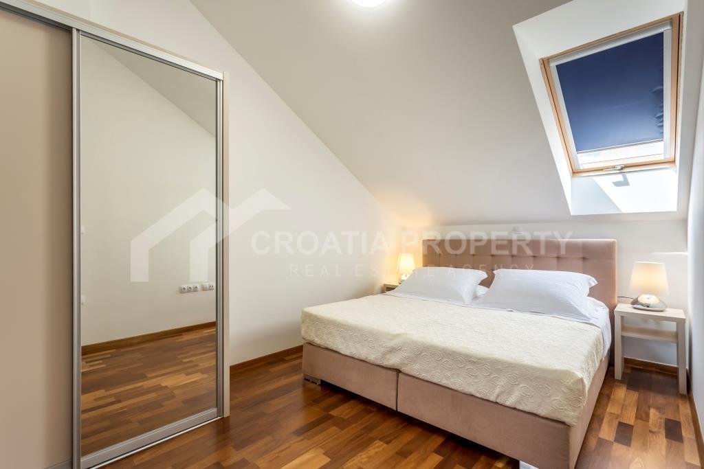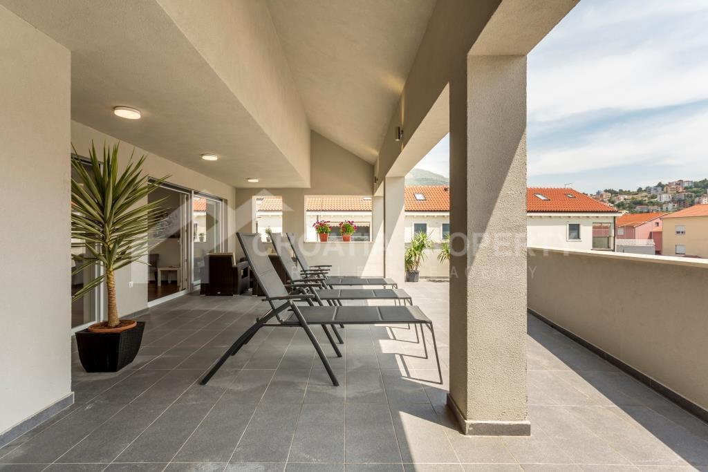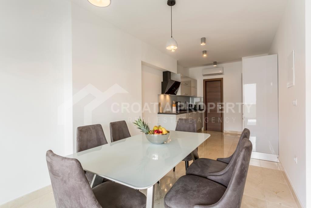 Na donjoj etaži apartman se sastoji od ulaznog prostora, hodnika, kupaonice, spremišta, izuzetno velikog dnevnog boravka i kuhinje koja je povezana s blagovaonicom. Cijeli donji kat otvara se na prostranu terasu s slikovitim pogledom na more, uz manju terasu. Gornji kat sadrži hodnik, glavnu spavaću sobu s vlastitom kupaonicom, dvije dodatne spavaće sobe i drugu kupaonicu. Trosobni apartman uz more Podstrana dolazi potpuno namješten i opremljen, a sve je uključeno u cijenu. Svaka soba ima klima uređaj, a vanjski prozori su od PVC-a. Vlasnička dokumentacija je uredna.