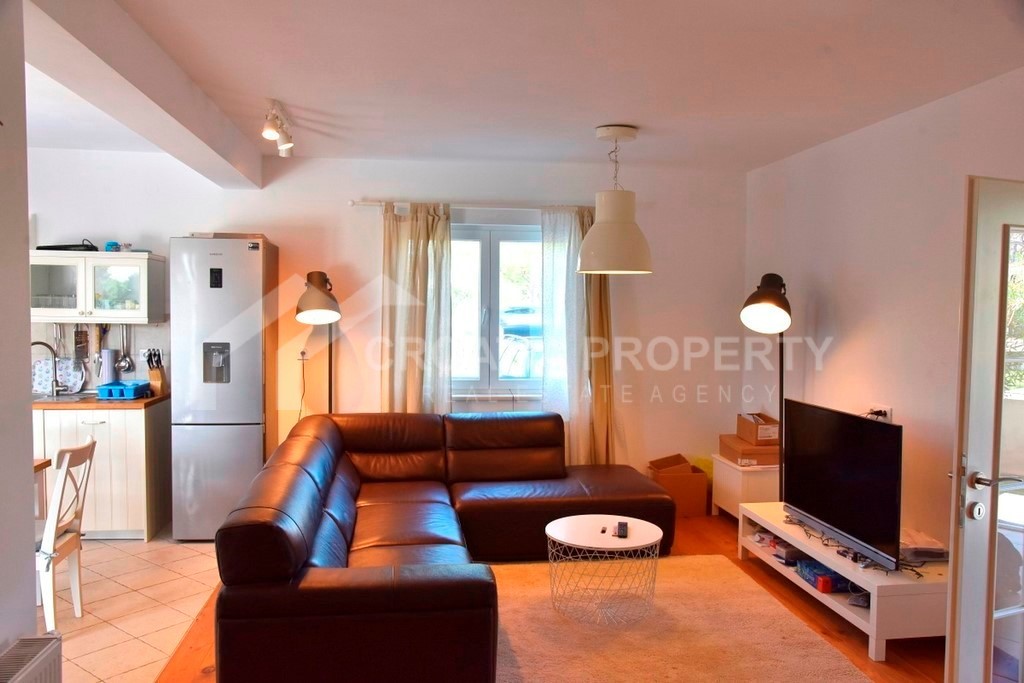 An attractive an beautiful spacious house Tribunj is a new property with a surface of 138 square meters and placed on a plot of 515 square meters. The house itself consists of a ground floor and the first floor. The ground floor contains an entrance area, a storeroom, one bedroom, one bathroom and an open-plan living space. This space offers access to a paved terrace, continuing onto a garden with pool and sundeck. Internal stairs lead to the upper floor with three more bedrooms (each with an en-suite bathroom), a storage room and a terrace.