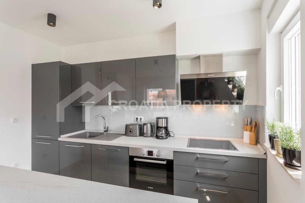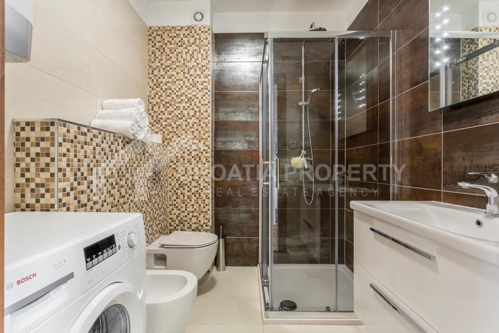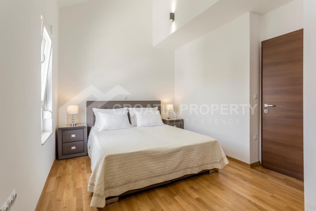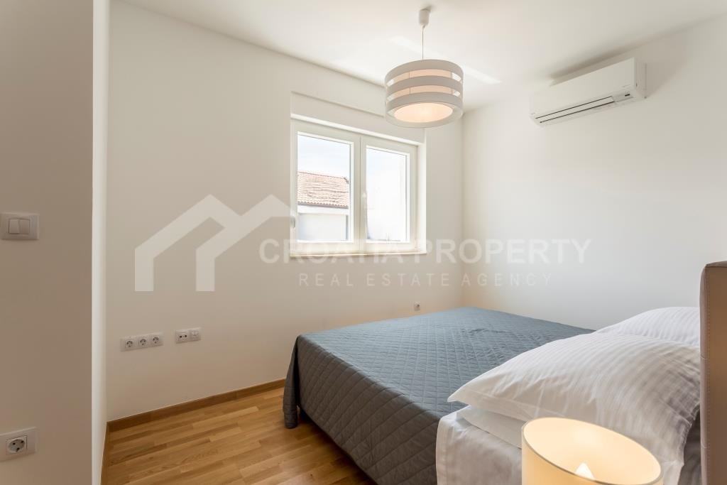 The lower level features an entrance hall, a hallway, a bathroom, a guest toilet, and two generous bedrooms, each equipped with its own wardrobe. One of these bedrooms offers access to a small loggia. Additionally, there is a large living area that includes a kitchen and dining space. Both the living and dining rooms lead out to a second loggia that overlooks the sea.On the upper level, you’ll find a gallery that serves as a perfect play area and an additional bedroom with its own bathroom. The capacious apartment by the beach Podstrana comes fully furnished and equipped, with all items included in the asking price. Each room is fitted with air conditioning, and the external wooden features are made from PVC. Moreover, the property also includes two designated outdoor parking spots, which are part of the sale. The ownership documents are in good order.