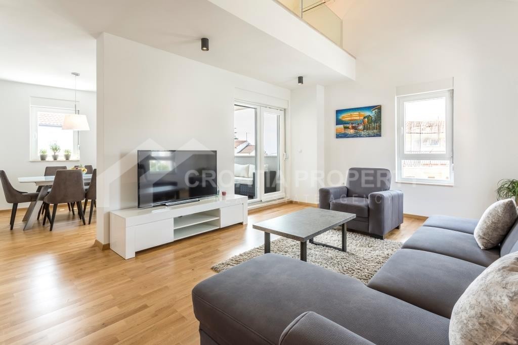 We mediate in the sale of a remarkably large apartment situated in an excellent area, ideal for both residential living and rental purposes. The property is conveniently located near the beach, and all essential services such as shops, cafes, and other amenities can be reached within a brief two-minute walk. The capacious apartment by the beach Podstrana occupies the second floor of a petite building and spans two levels. It boasts an impressive total area of 162 square meters, with 153 square meters dedicated to the living space.