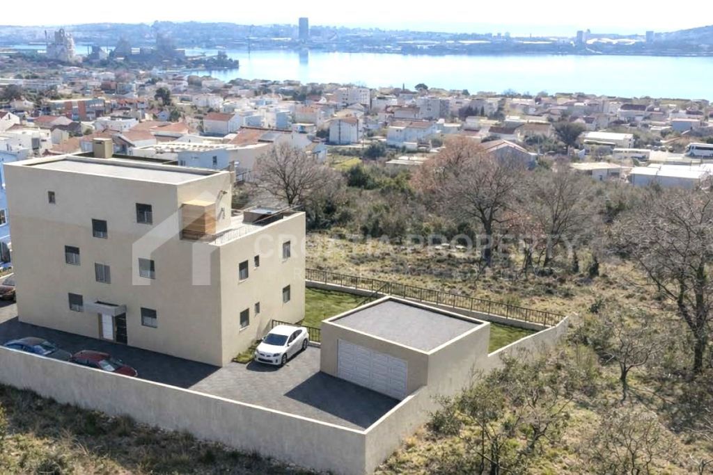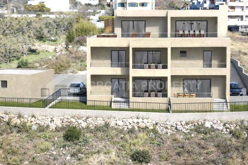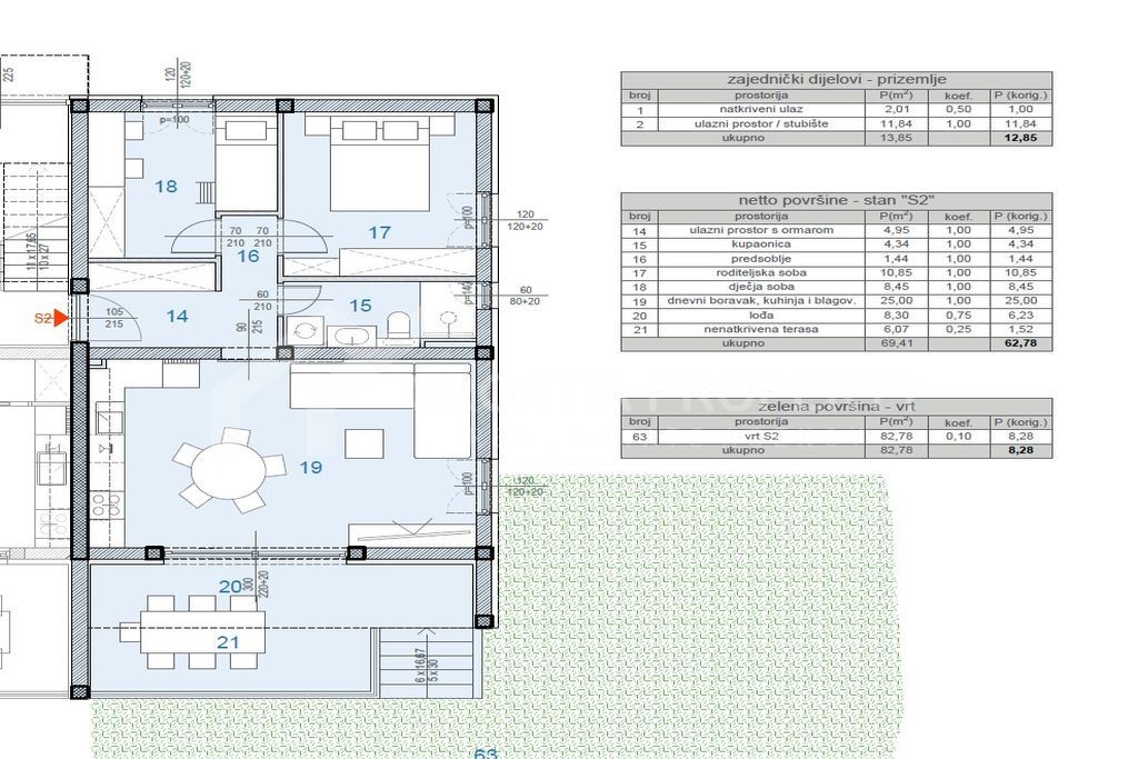 We mediate in the sale of apartments in a new development situated in Kastel Sucurac. This building is positioned on a serene street, elevated above the expressway, offering all apartments a southern aspect with views of Kastela Bay. It consists of three cozy two-bedroom units and one opulent two-story three-bedroom residence that includes a garage. Apartment S2 is situated on the ground floor, featuring an interior area of 55. 04 m2, a terrace measuring 14. 37 m2, and a garden of 82. 78 m2.