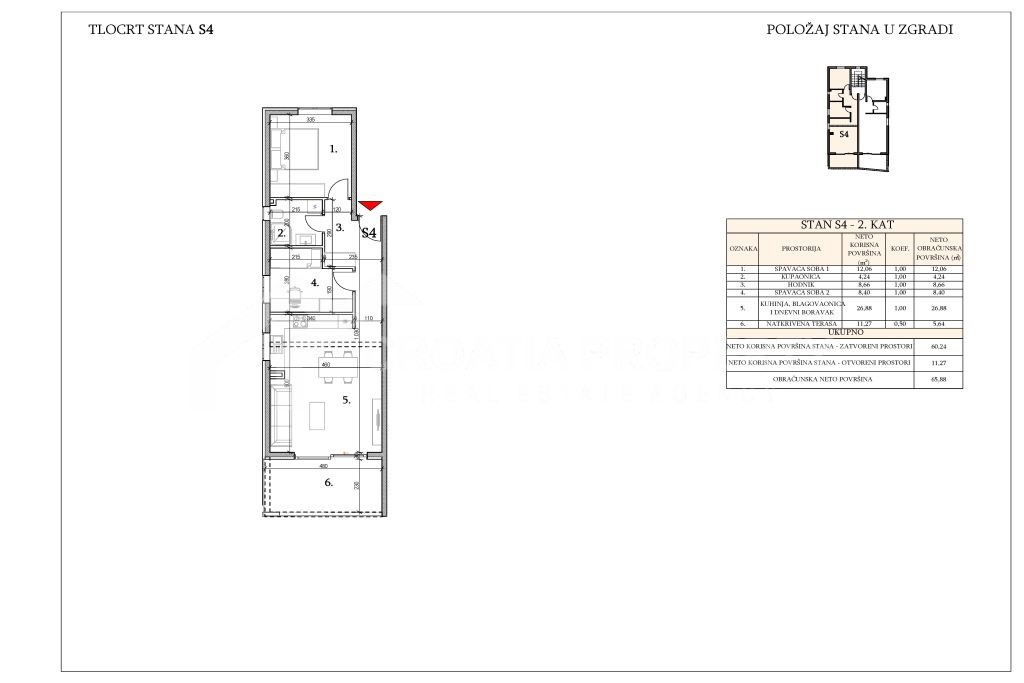 Currently under construction, for sale is a sea and city view apartment Makarska. The apartment is placed on the second floor of a smaller building. The building is in a very quiet location in the west of Makarska. It has an area of 65.88 square meters. There is a hallway, a bathroom, 2 bedrooms, a kitchen with a large living room. Exactly the kitchen and the living area offer access to a covered terrace with a gorgeous view of the city and the sea.