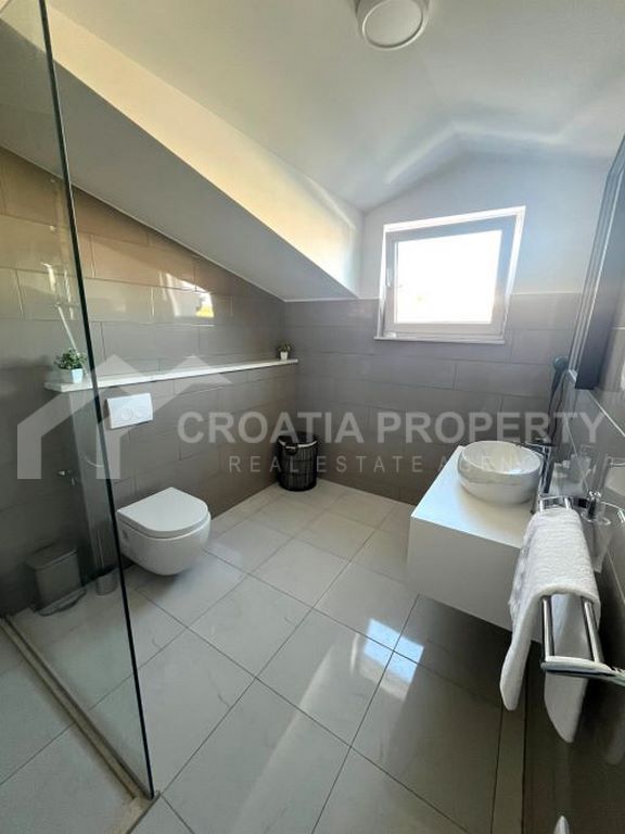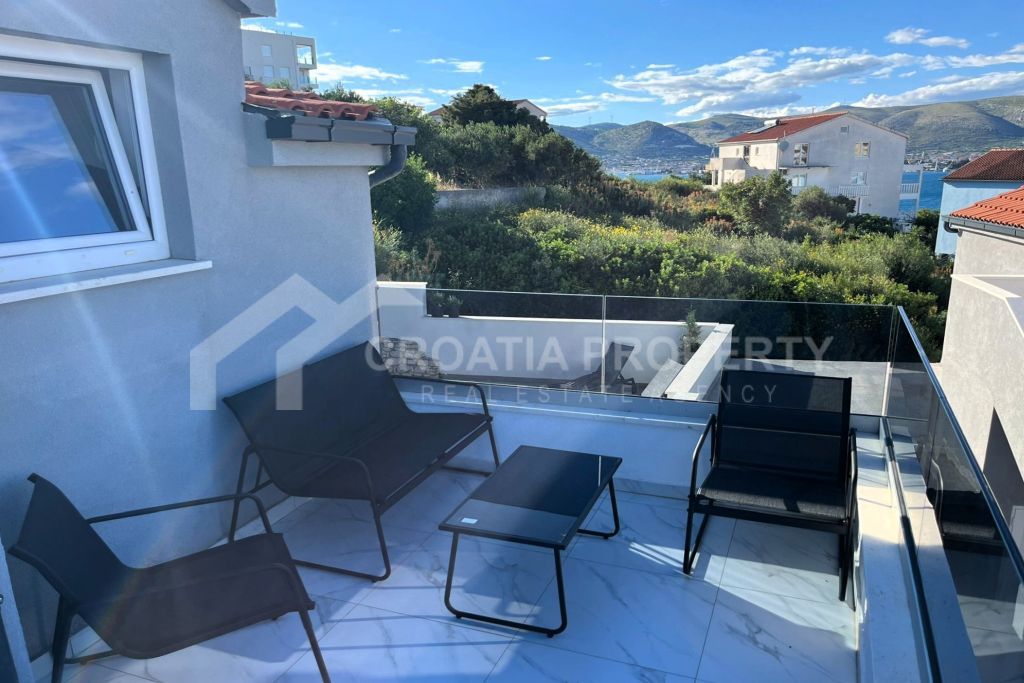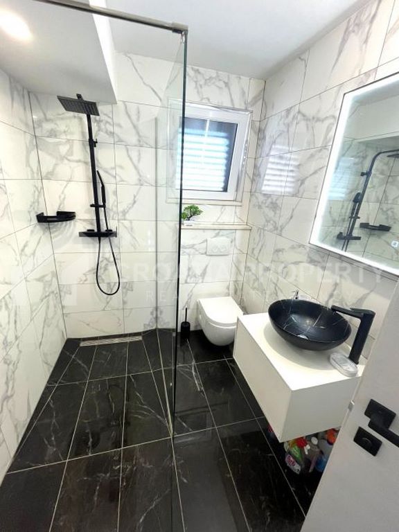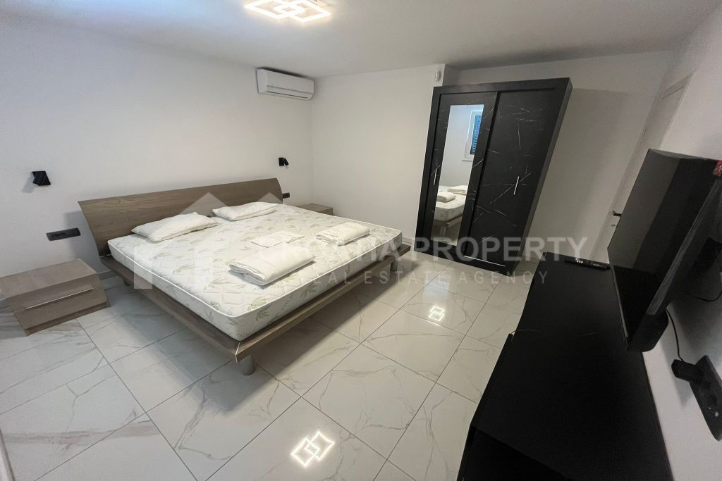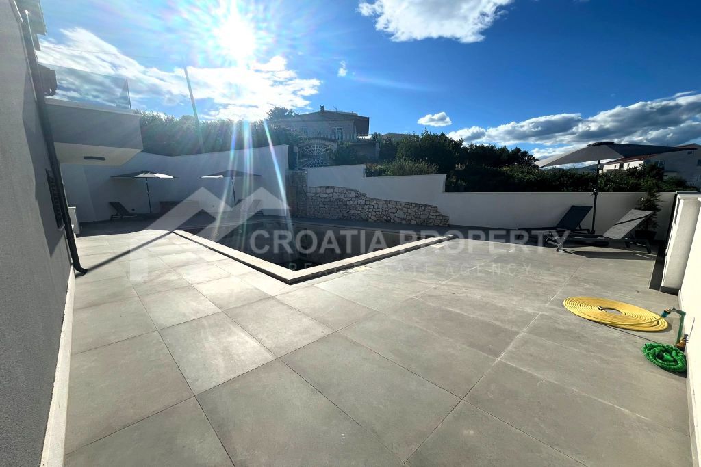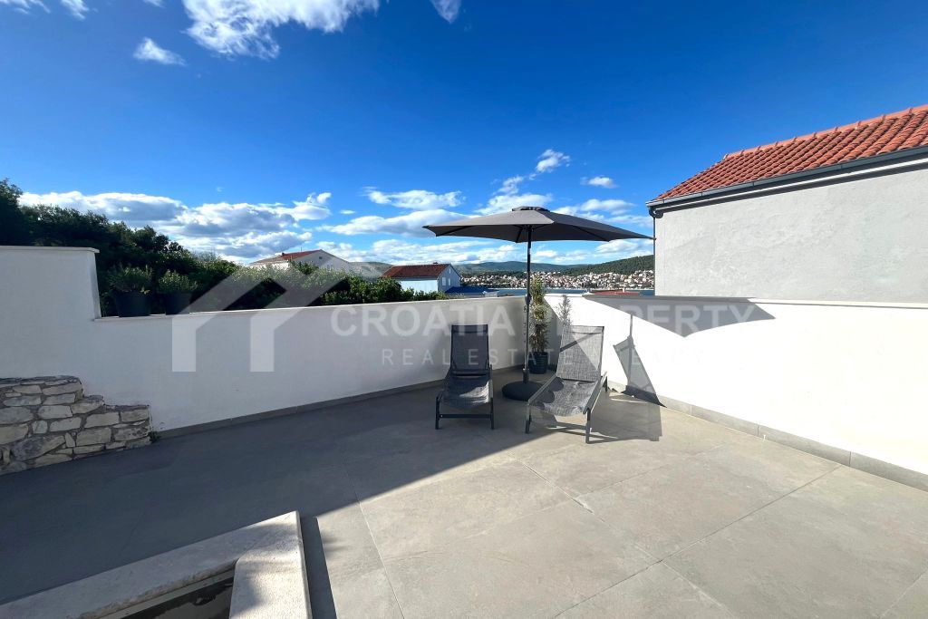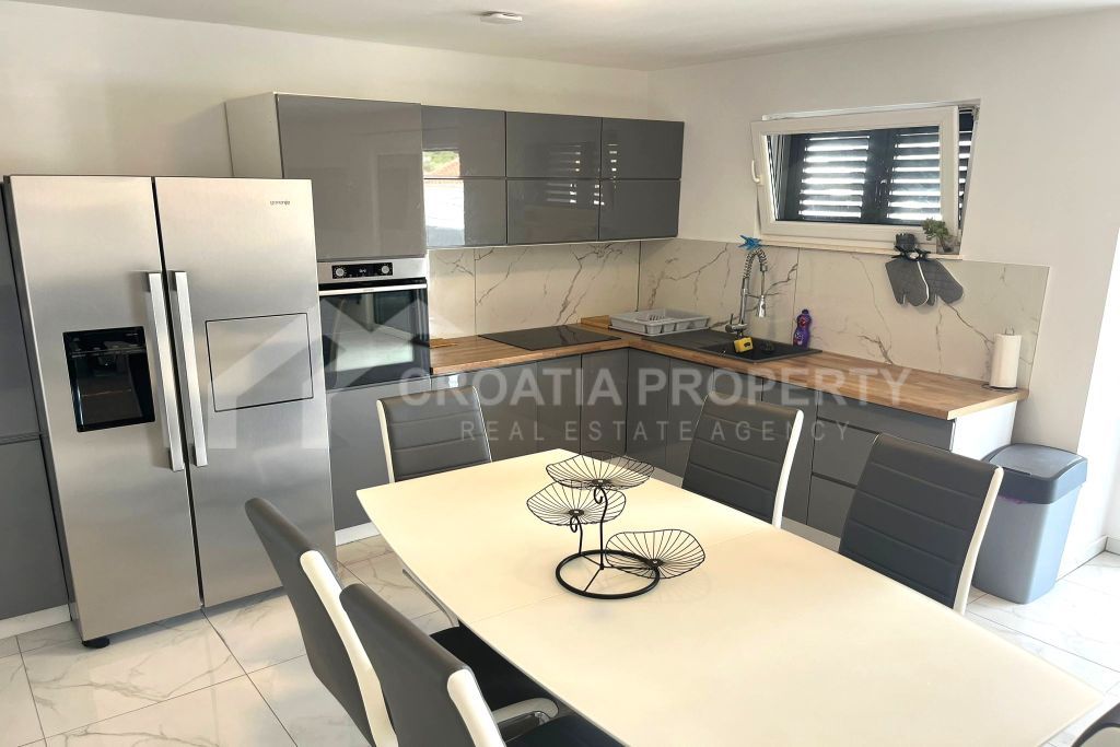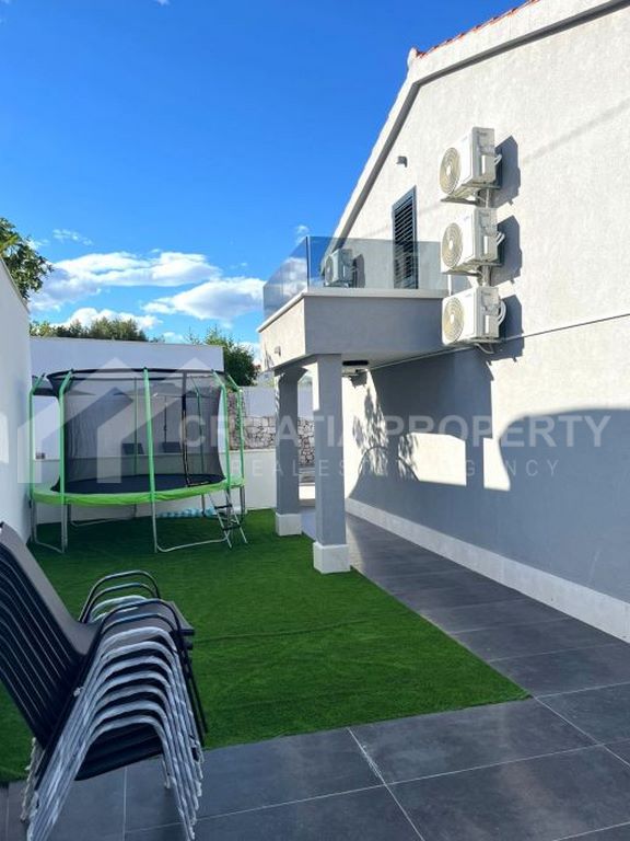 We mediate in the sale of a stunningly modern house that has been fully renovated, featuring two generous apartments located in a tranquil area of Okrug Gornji on the island of Ciovo. This property is situated on a 435m2 lot and offers great opportunities for residential living as well as for vacation rentals due to its dual apartment layout and its proximity to a serene beach. The spacious detached house near the sea Ciovo boasts a newly designed exterior along with updated plumbing and electrical systems. Additionally, fresh waterproofing has been applied around the home and on the balconies. The property features new PVC windows, a refurbished roof, and a modern rainwater drainage system.