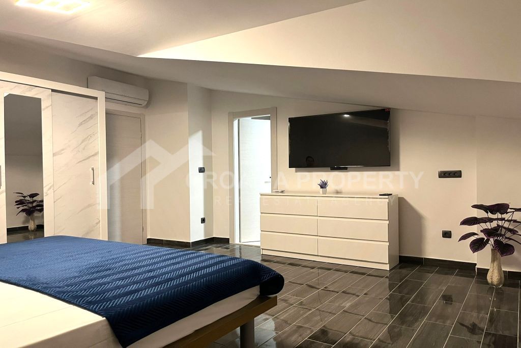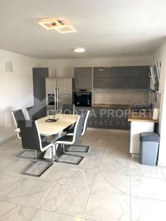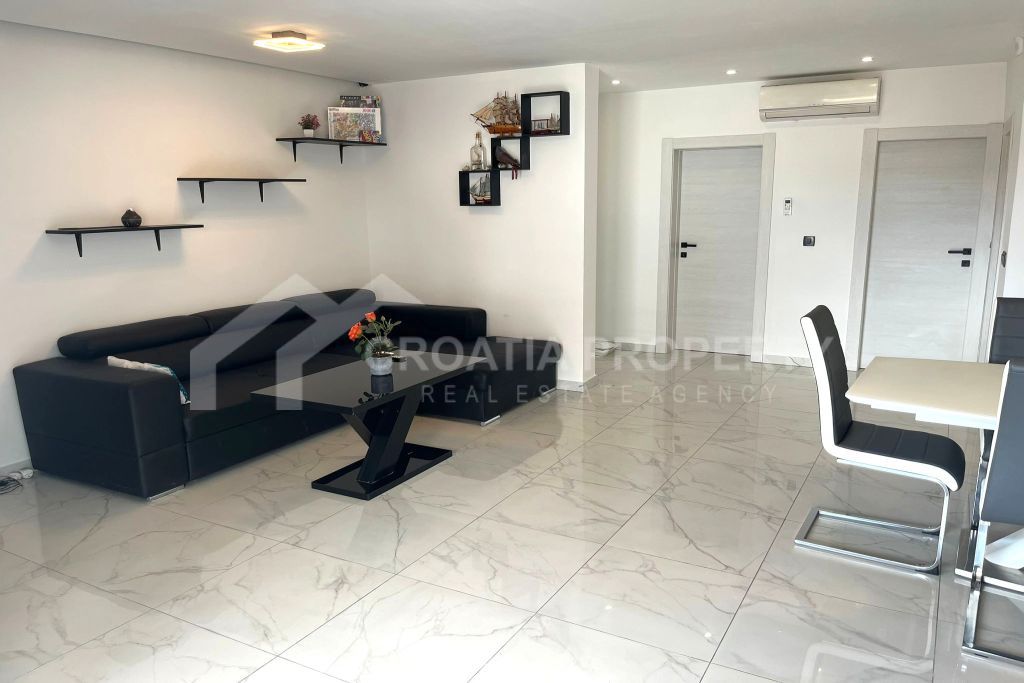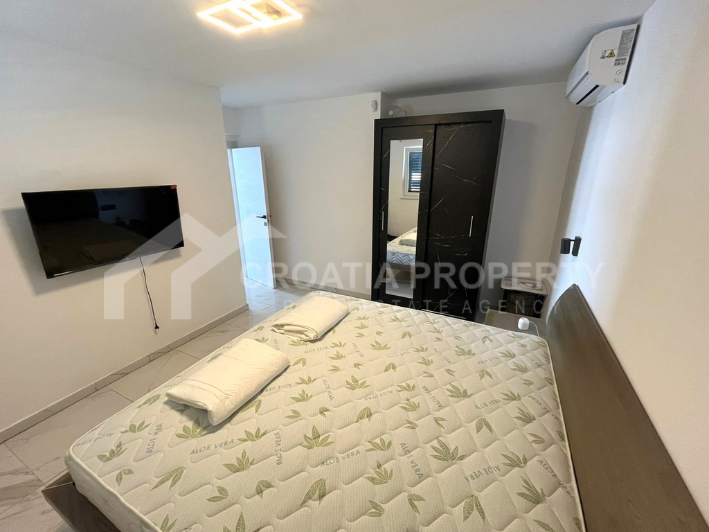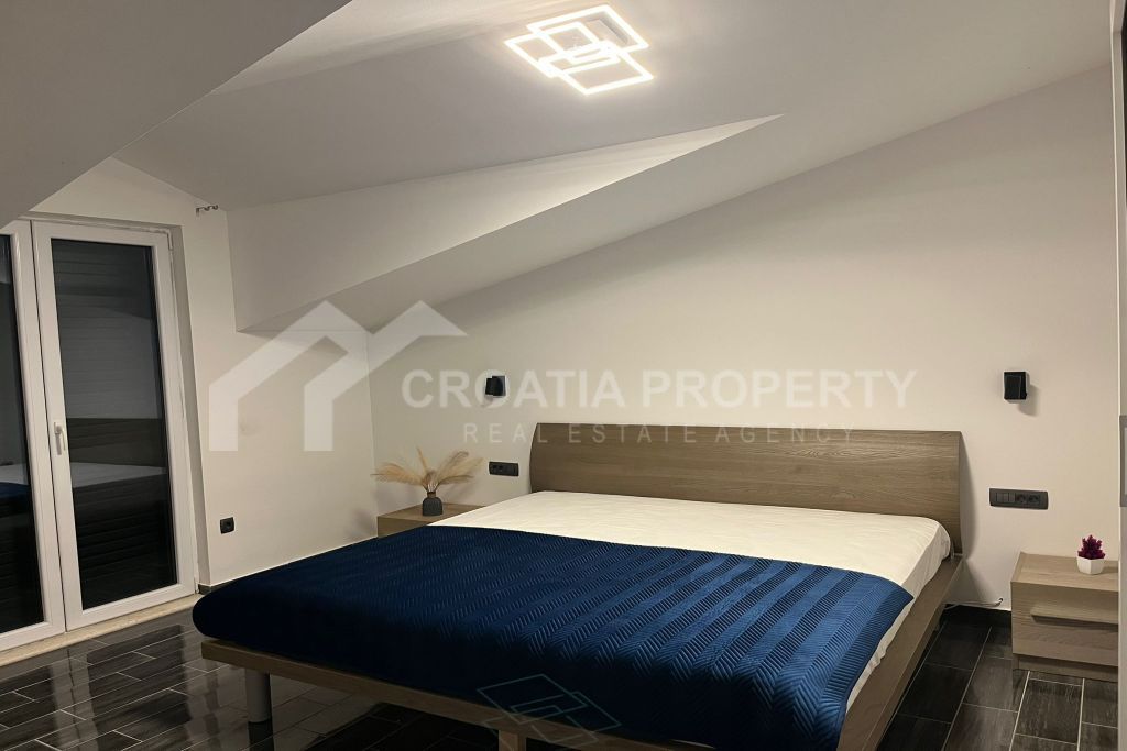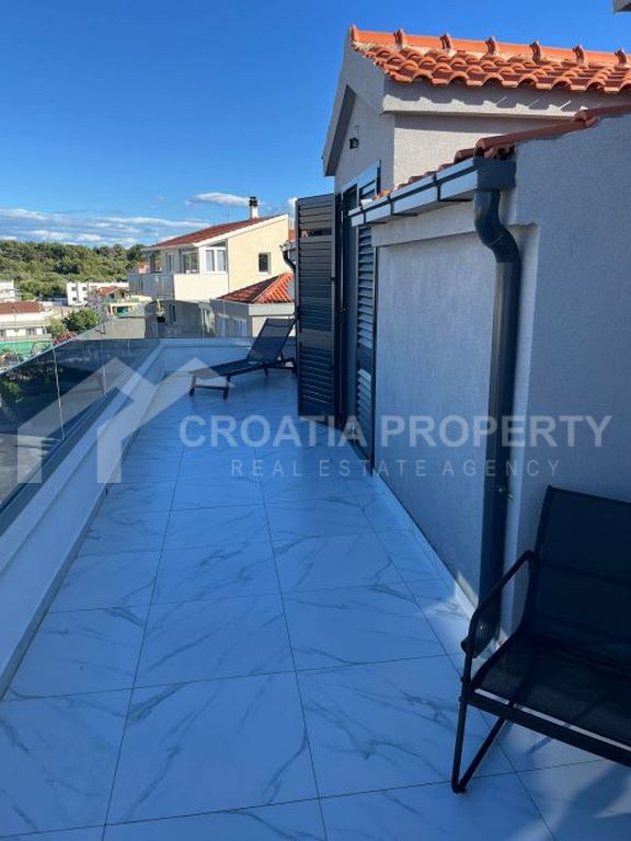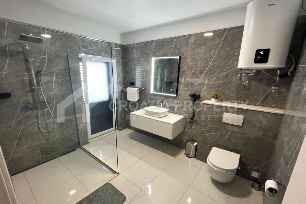 We mediate in the sale of a stunningly modern house that has been fully renovated, featuring two generous apartments located in a tranquil area of Okrug Gornji on the island of Ciovo. This property is situated on a 435m2 lot and offers great opportunities for residential living as well as for vacation rentals due to its dual apartment layout and its proximity to a serene beach. The spacious detached house near the sea Ciovo boasts a newly designed exterior along with updated plumbing and electrical systems. Additionally, fresh waterproofing has been applied around the home and on the balconies. The property features new PVC windows, a refurbished roof, and a modern rainwater drainage system.